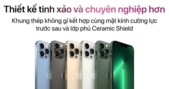 iPhone 13 Pro sở hữu khung thép không gỉ, mặt lưng kính nhám, tạo cảm giác chắc tay và cao cấp. Máy có khả năng chống nước chuẩn IP68, giúp an tâm khi sử dụng trong điều kiện mưa nhẹ hoặc vô tình bị đổ nước.