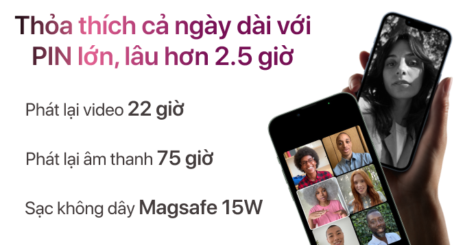 iPhone 13 Pro có pin tối ưu tốt, đủ dùng cho cả ngày với các tác vụ như lướt web, chụp ảnh, xem video hoặc chơi game nhẹ. Máy hỗ trợ sạc nhanh và sạc không dây MagSafe, tiện lợi cho mọi nhu cầu sử dụng.