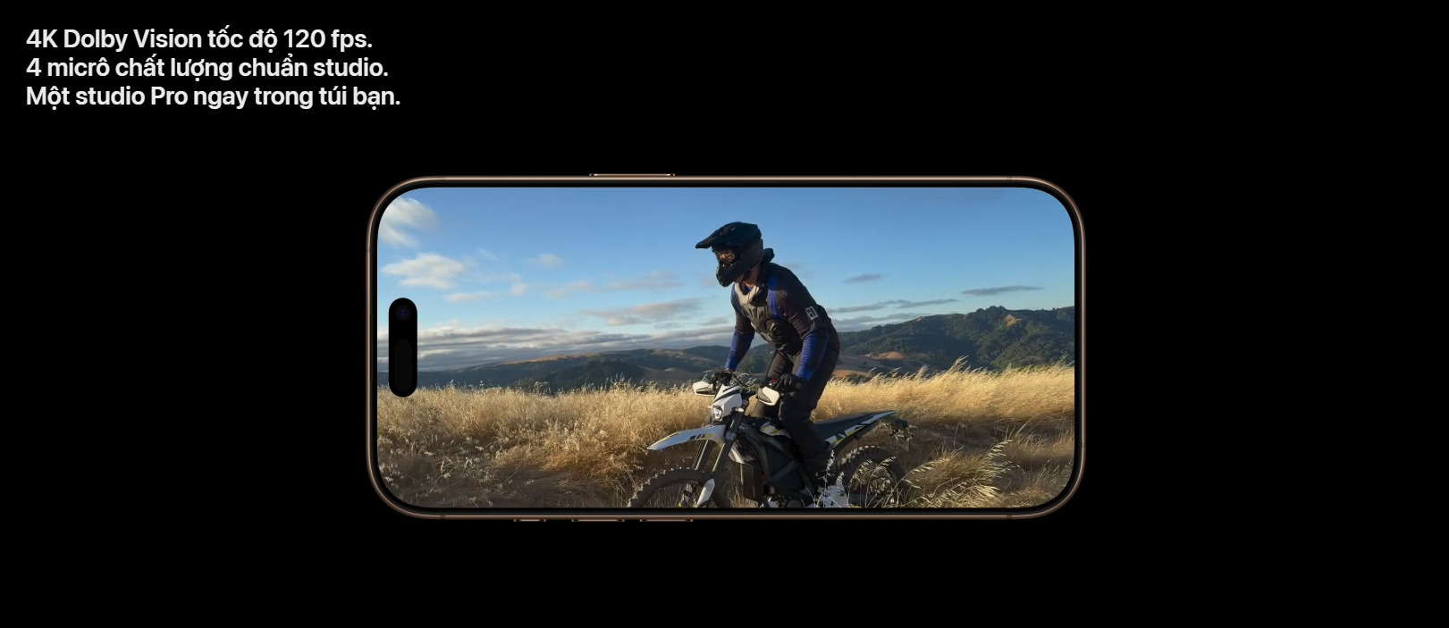 Đặc biệt, tính năng quay video 4K Dolby Vision ở tốc độ 120 fps mang lại trải nghiệm điện ảnh đẳng cấp. Người dùng có thể điều chỉnh tốc độ phát sau khi quay video để tạo ra các hiệu ứng chậm độc đáo. iPhone 16 Pro cũng được trang bị bốn micrô chuẩn studio, giúp ghi âm với chất lượng âm thanh trong trẻo, giảm thiểu tiếng ồn nền và mang lại âm thanh sống động hơn.